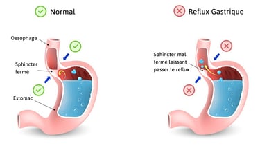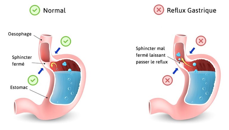 Gastroesophageal reflux (GER) refers to the involuntary backflow of stomach contents into the esophagus, sometimes reaching the mouth. This condition occurs due to the immaturity of the infant's digestive system, especially the muscle between the stomach and esophagus (the lower esophageal sphincter), which has not yet fully developed to close properly.